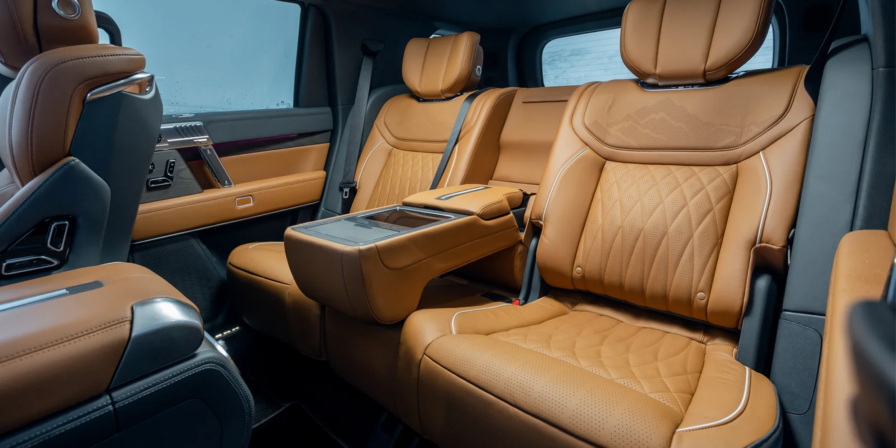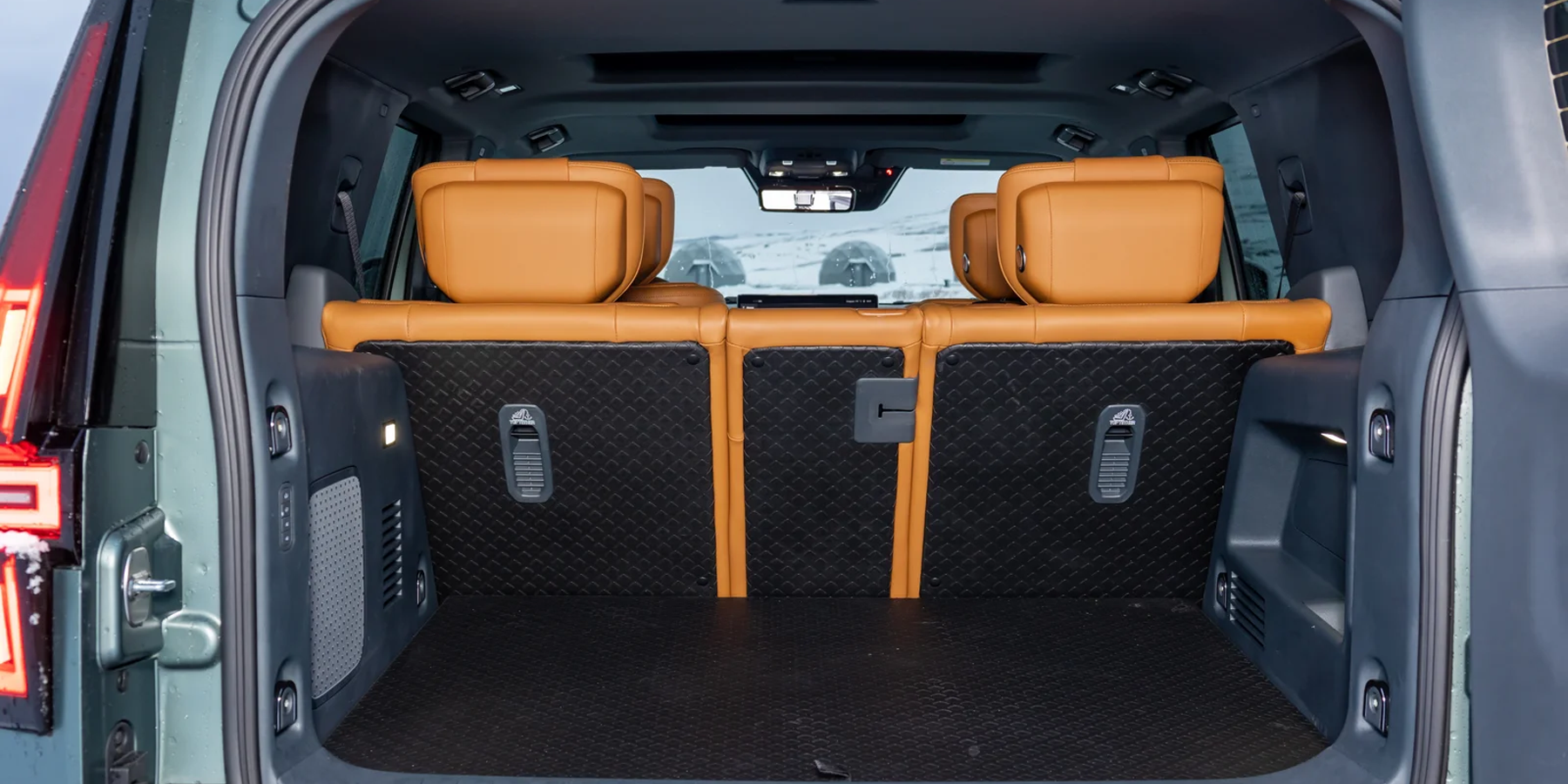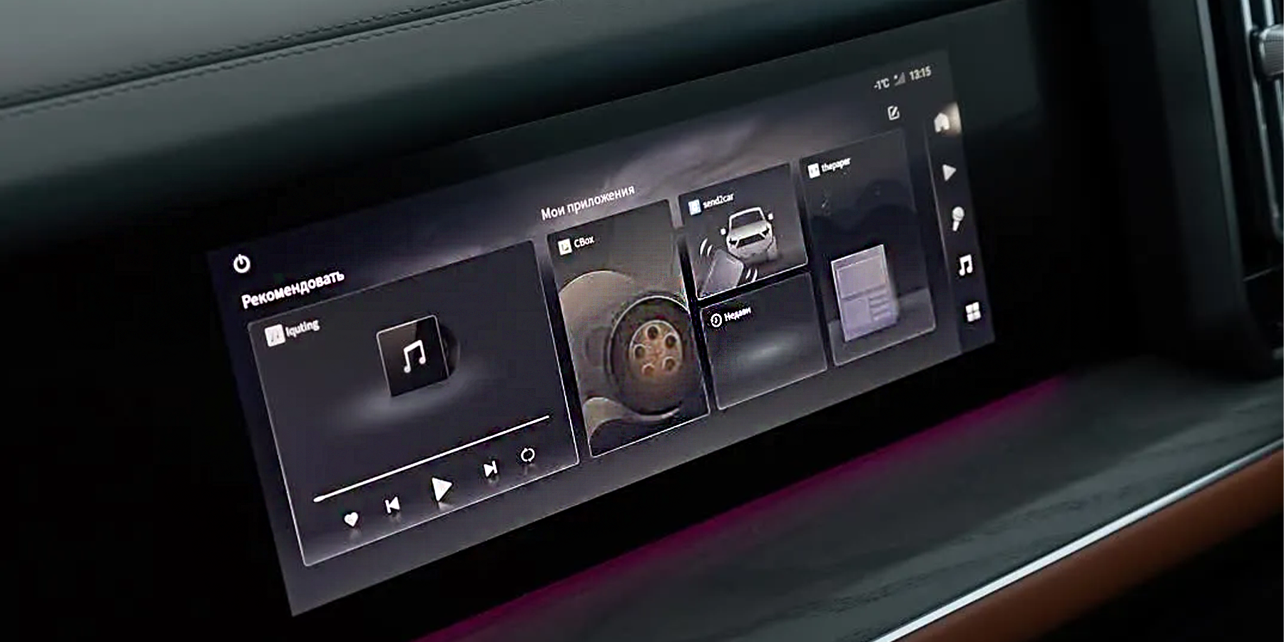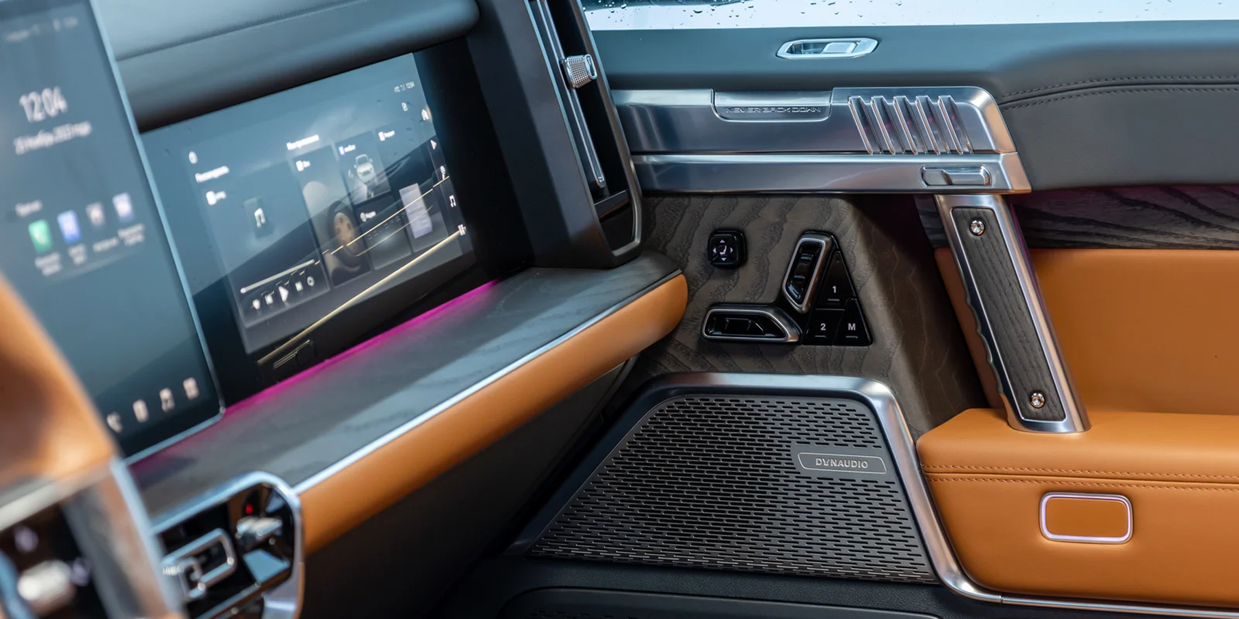 Само собой, предусмотрены все блага цивилизации — вентиляция и массаж в креслах, проекционный экран (причем цвет можно поменять с белого на синий, чтобы показания было видно на фоне снега!), беспроводная зарядка и мощная аудиосистема Dynaudio с 16 динамиками.