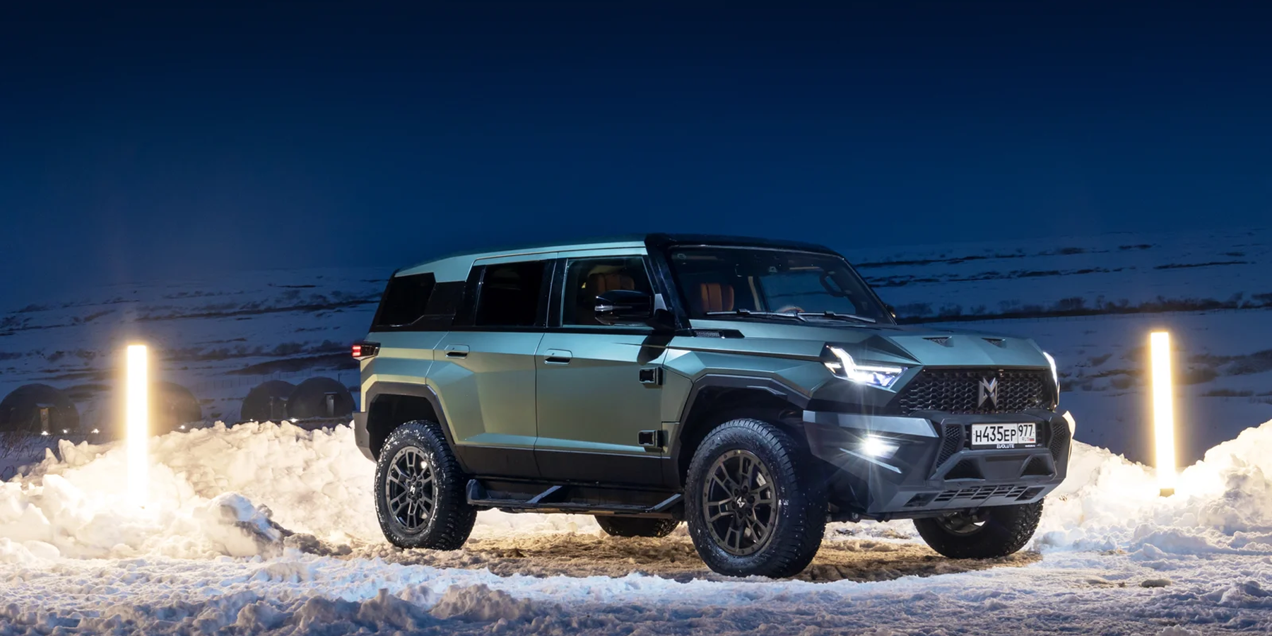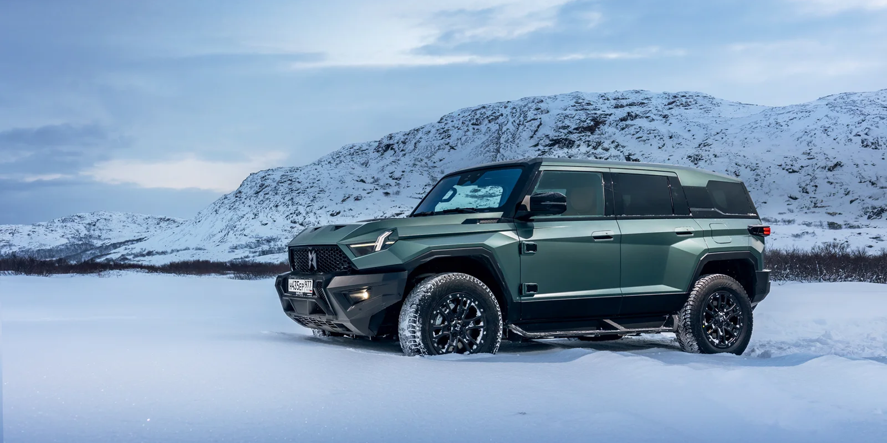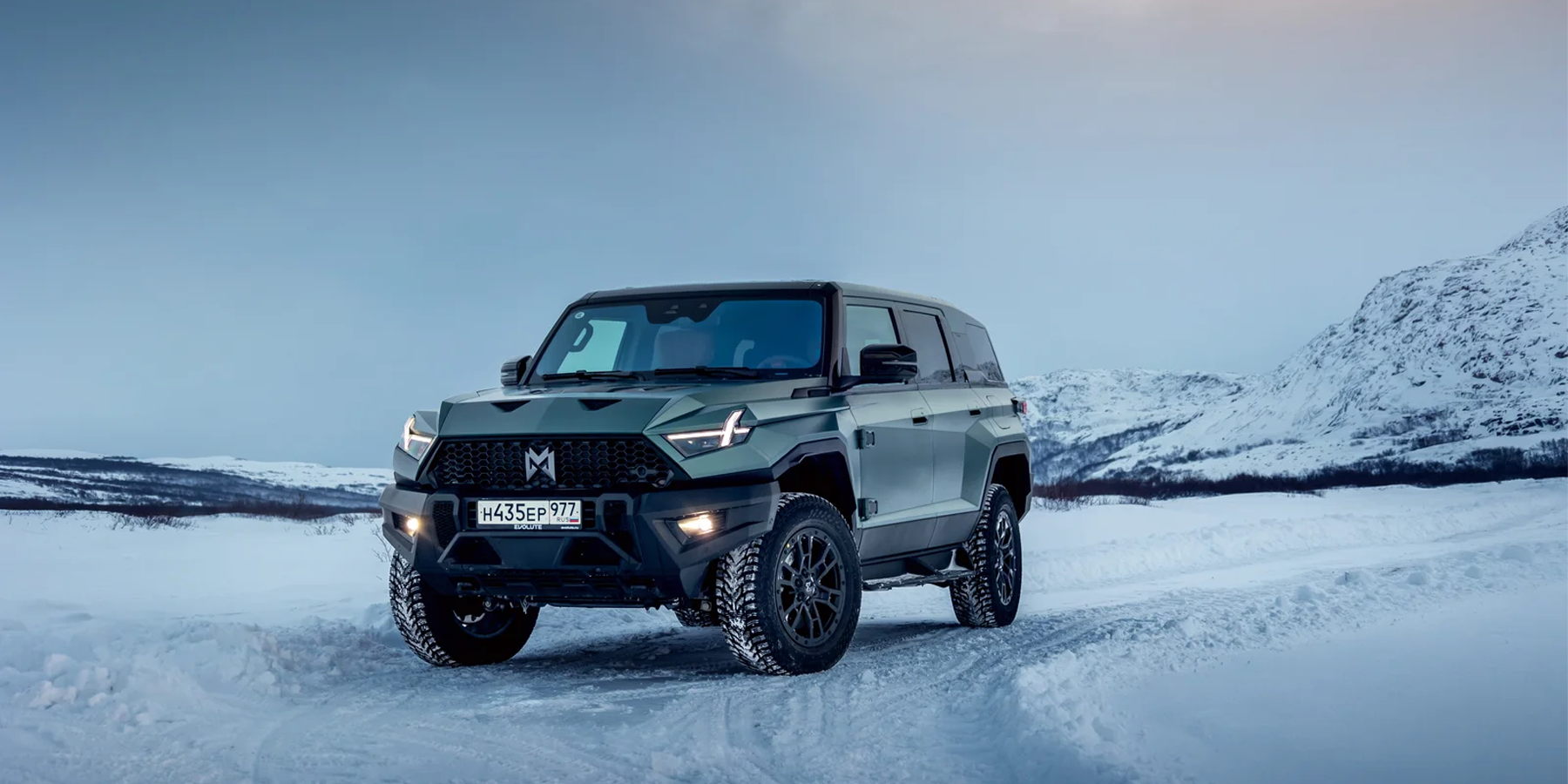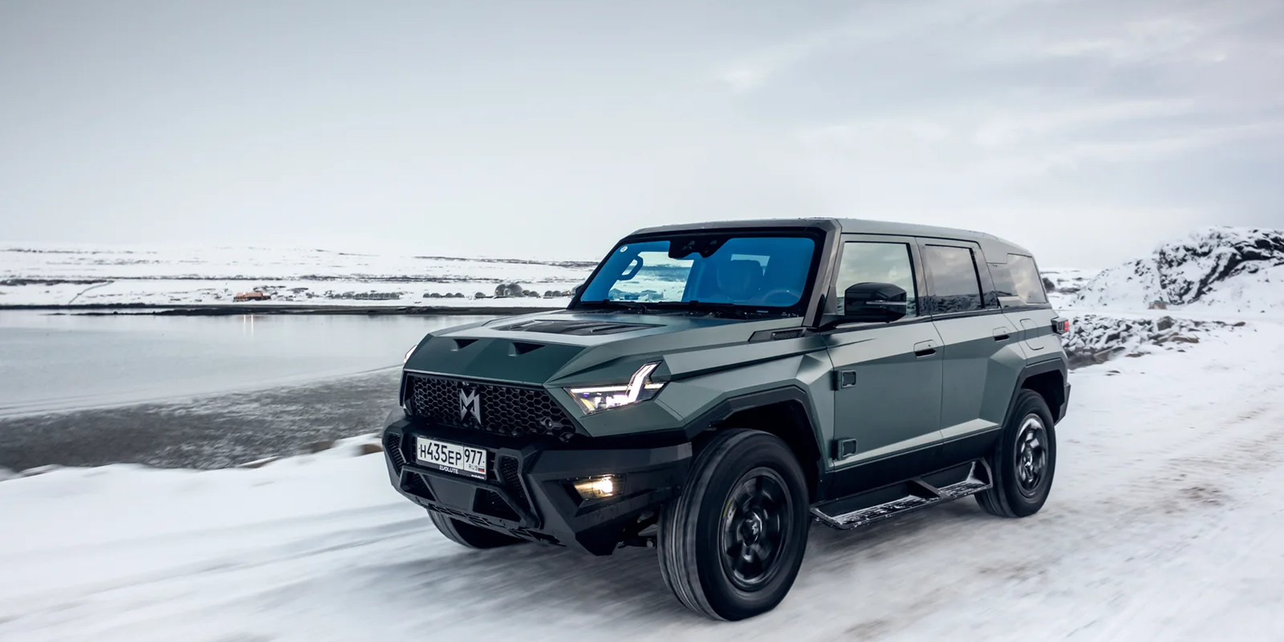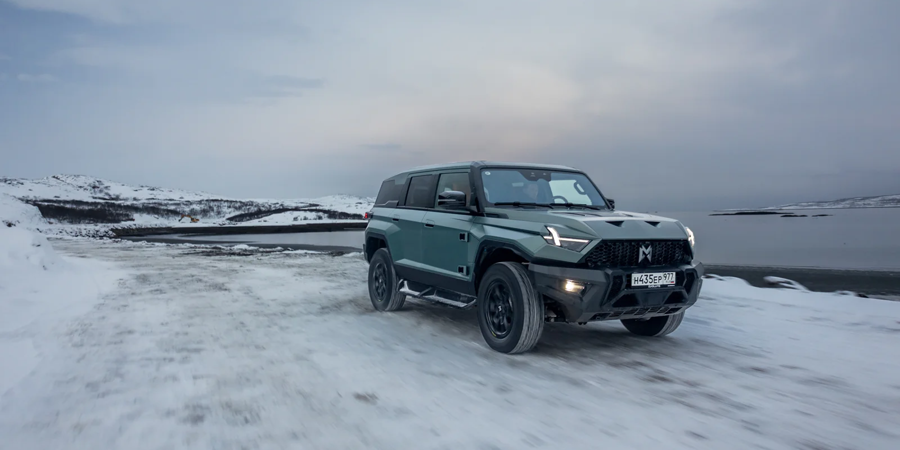 Выглядит он впечатляюще — особенно в суровых пейзажах зимнего Заполярья! И потрясает M-Hero I не только своими угловатыми формами, но и размерами: длина 5066 мм, ширина 2080 мм, высота 1934 мм. И, как ни странно, ездить на нем по дорогам совсем не сложно — благодаря плоским стеклам и панелям, а также высокой посадке за рулем, габариты чувствуются очень хорошо, а при парковке помогают камеры кругового обзора.