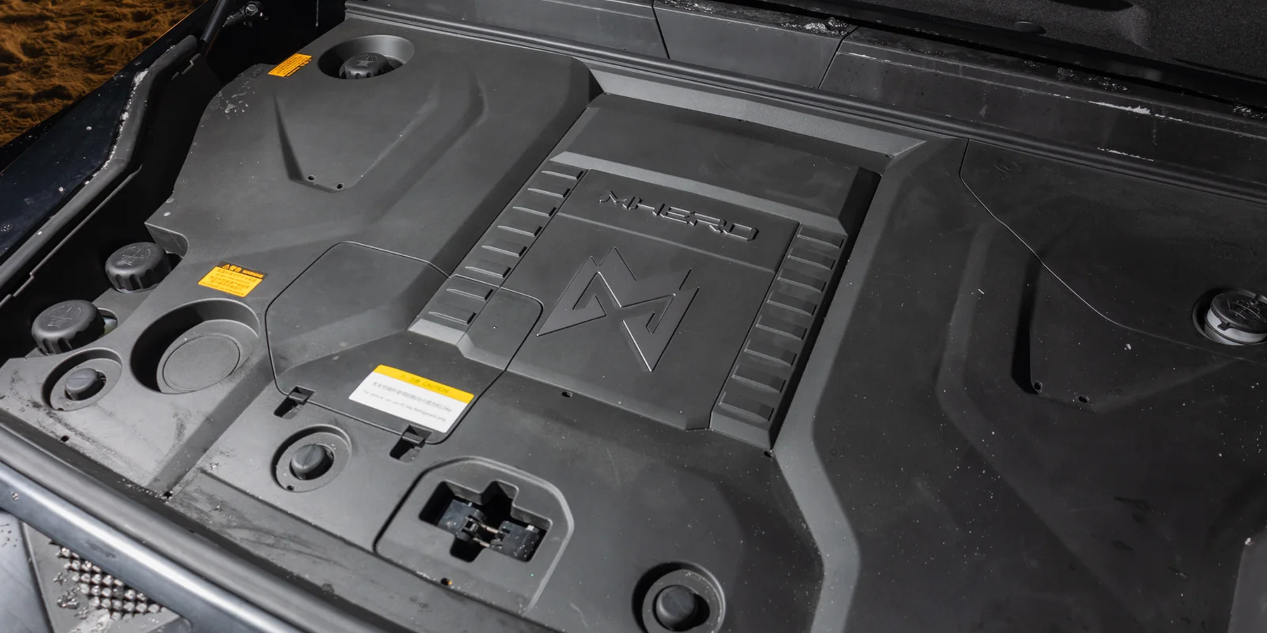 Батарея и электромоторы надежно защищены снизу мощными стальными панелями. Кроме того, доступен пакет внедорожных аксессуаров — «экспедиционный» багажник на крышу, мощная лебедка и кованые 20-дюймовые колеса на выбор, включая диски с так называемыми бедлоками — это дополнительные кольца с болтами, препятствующие разбортировке при движении со сниженным давлением. А в стандартное оснащение M-Hero I входят механические блокировки межколесных дифференциалов — работают они на скорости до 40 км/ч.